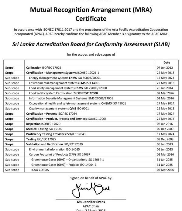 A signatory to Mutual Recognition Arrangement (MRA) of ILAC for: